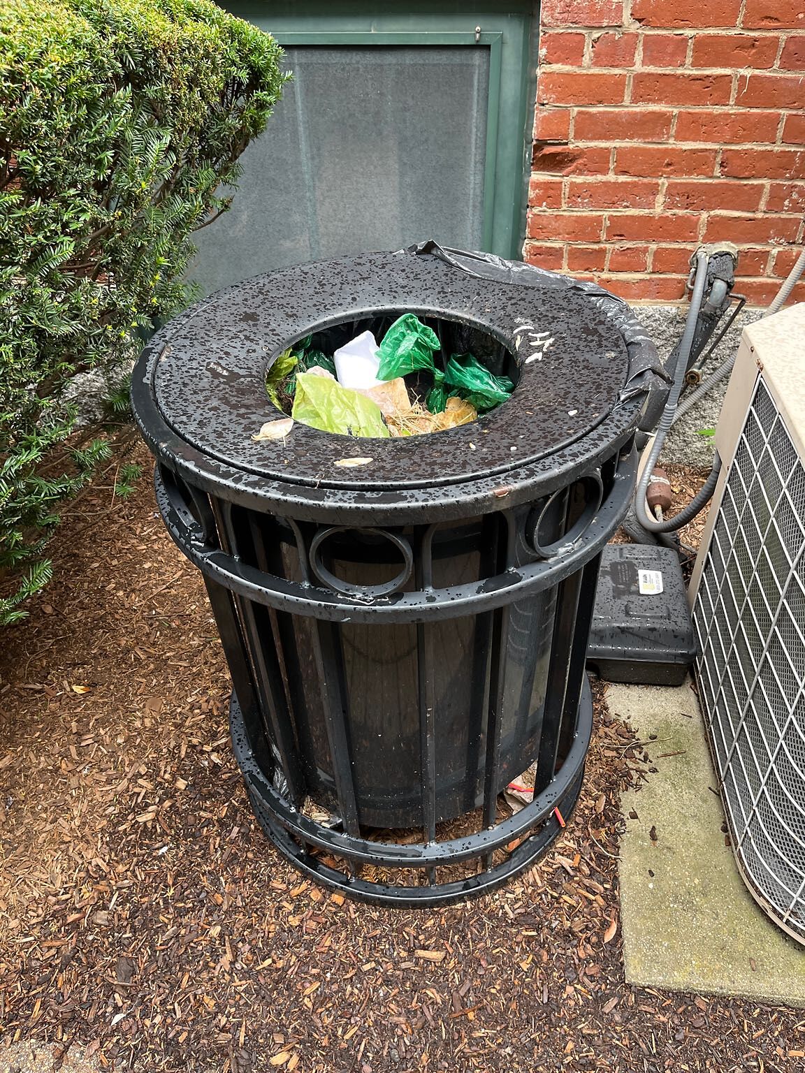 Trash barrel in public alleyway, full and wreaking bad odors attracting vermin.