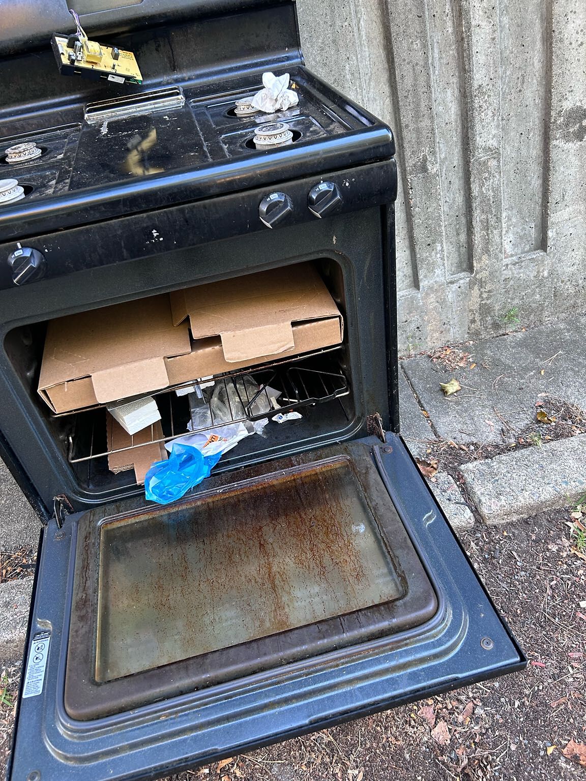 Abandoned stove. Been there for over a week. Is this Star Market property? Please remove asap. Trans and use needles accumulating