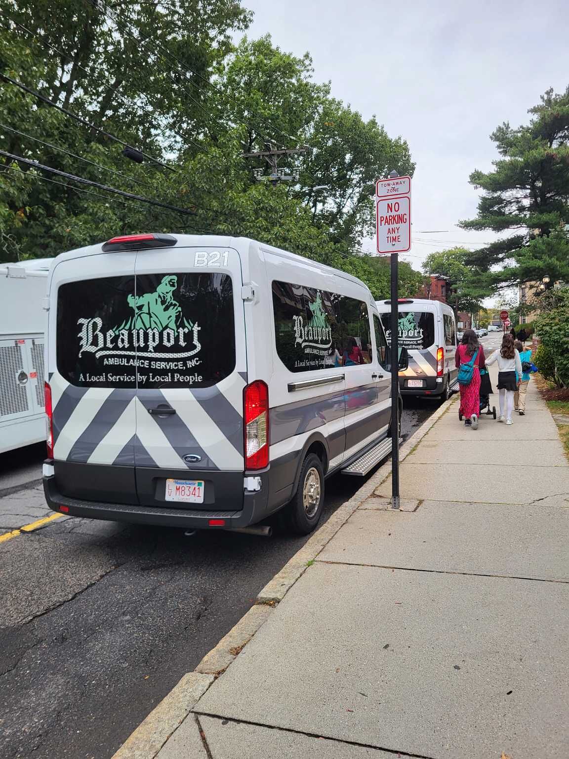 2 vans parked in front of a no parking sign. Blocking entire traffic lane.