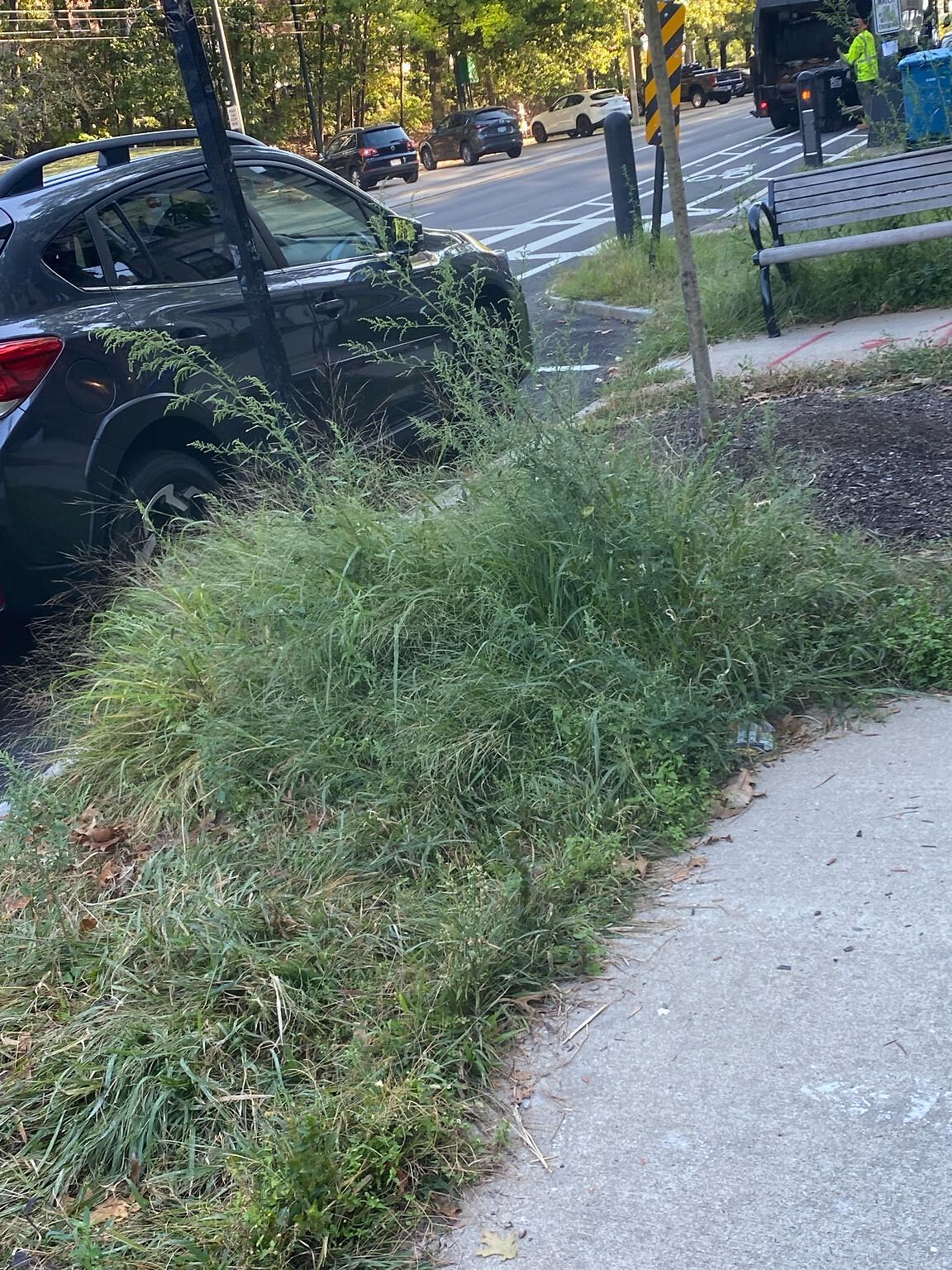 Overgrown weeds on the street. Hard to load/unload kids into car parked in those parking spots