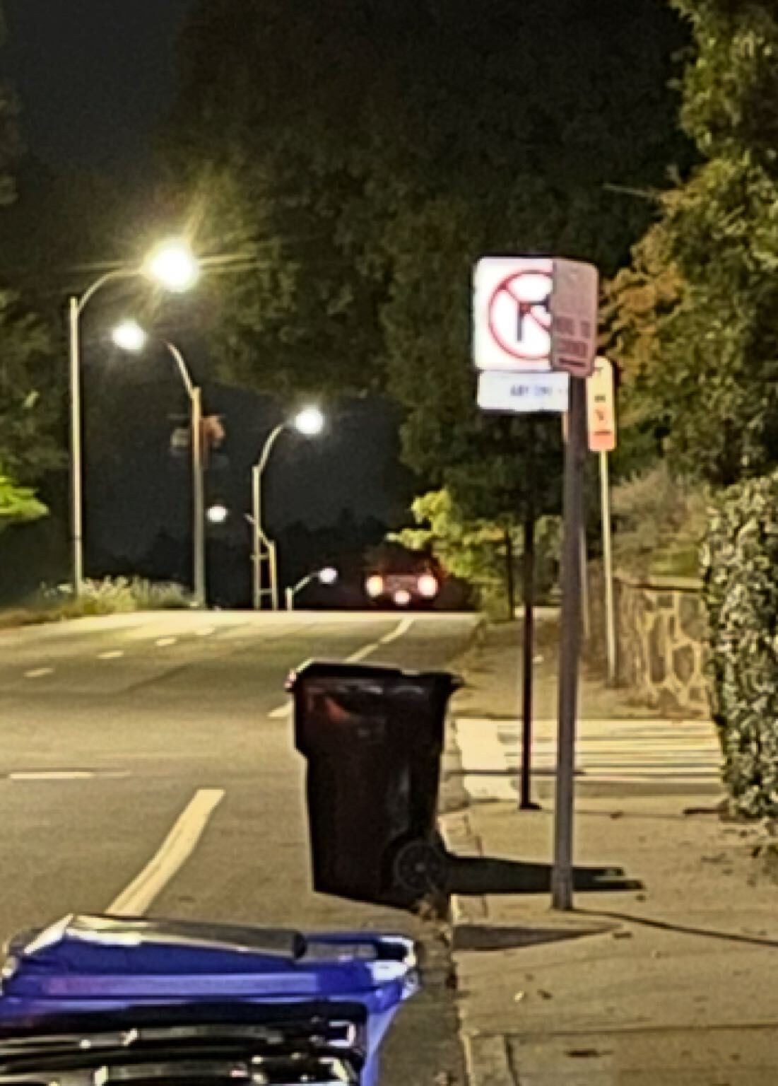 Residents’ trash bins on State Highway at 401 Boylston St, even though all other residents put bins on curb. Offender knows it endangers Cyclists, but does it anyway repeatedly.