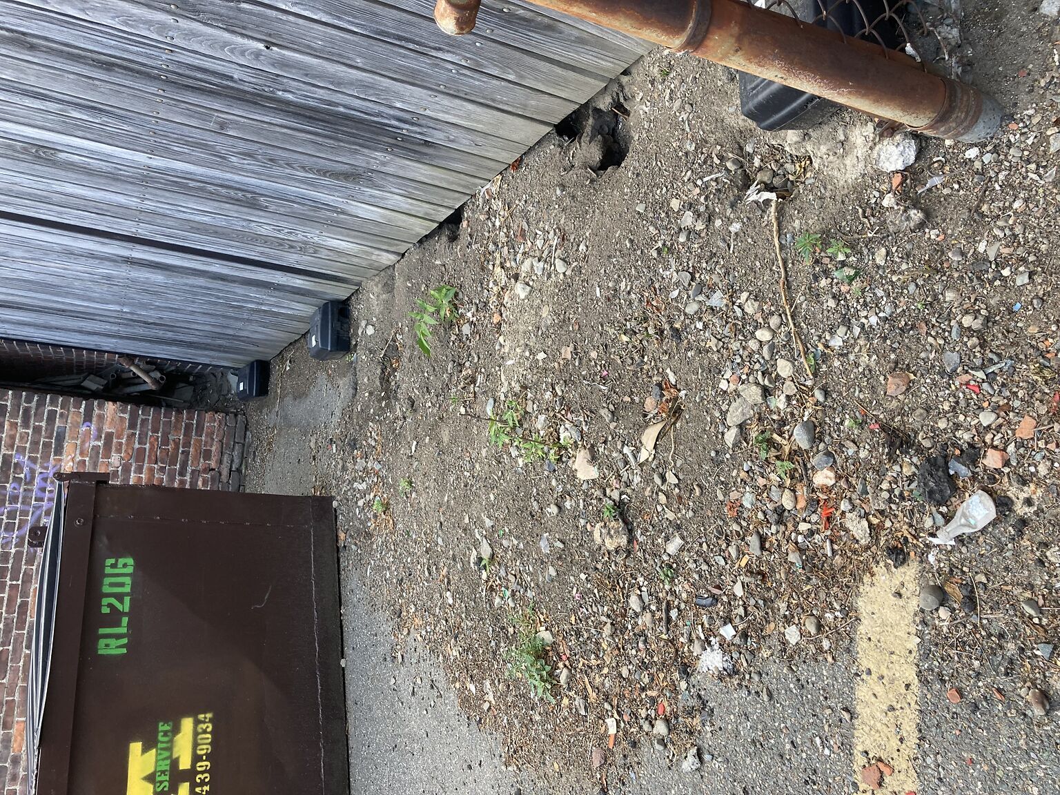 See case SR 100562. Here is photo of the rat holes along the fence in the back left corner of the yard parking lot. They feed on trash left on the ground.