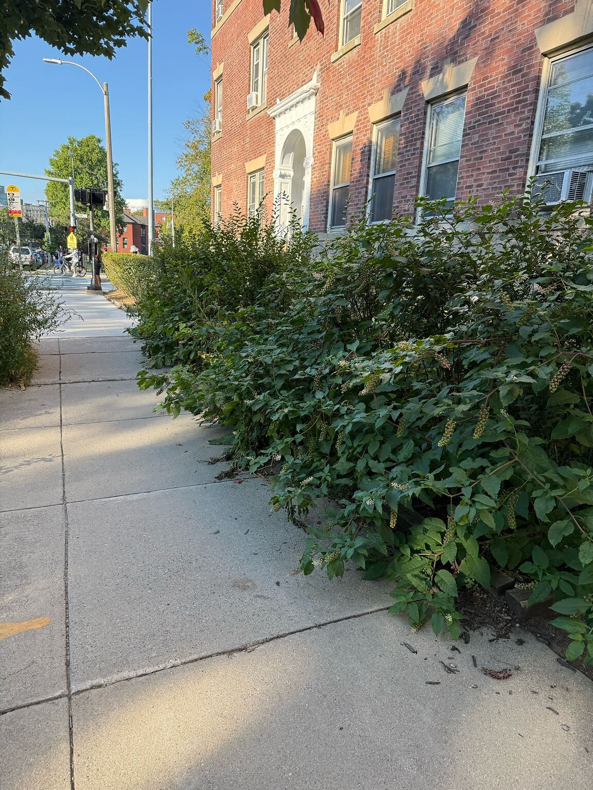 Your request has been received and is currently pending investigation by the Highway/Sanitation Department. Upon investigation, if the site has a sidewalk obstruction the property owner will be notified and will have 21 days to address the issue, per Town Sidewalk Obstruction Regulations. After those 21 days the location will be reviewed again. To follow up on your request, please email dpwenforcement@brooklinema.gov. -