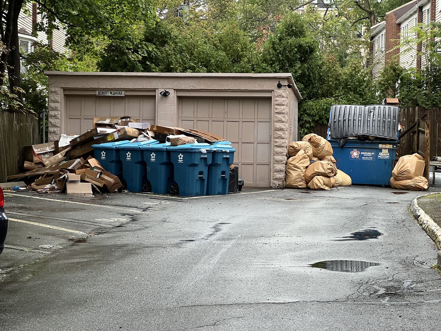 Trash/recycling is always overflowing, loose trash, bins not closed - dead rat seen next to trash and rat activity seen