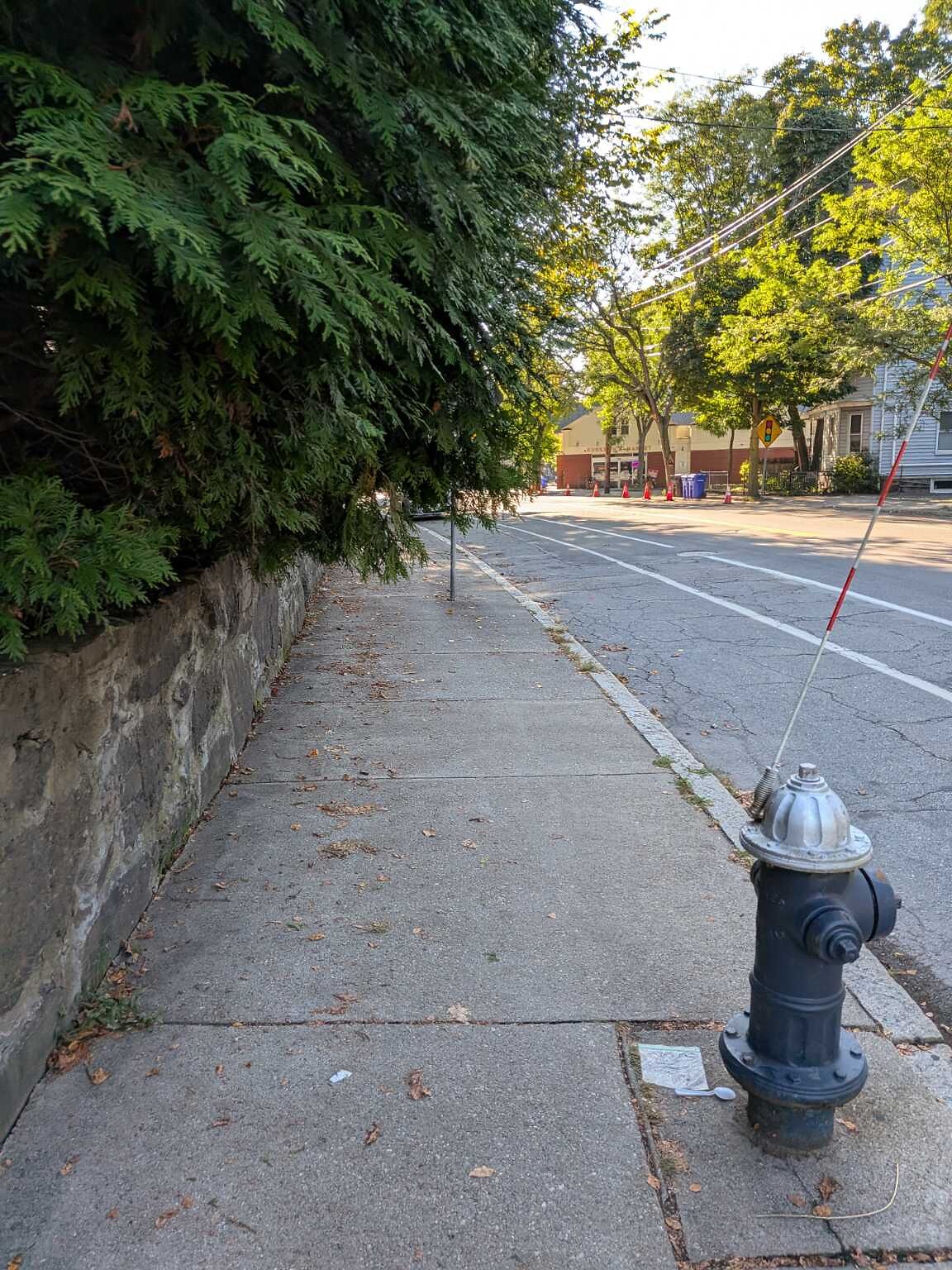 Why does the owner of this bush not been made to trim it? It has blocked the sidewalk since spring. Please take action to remove the obstruction