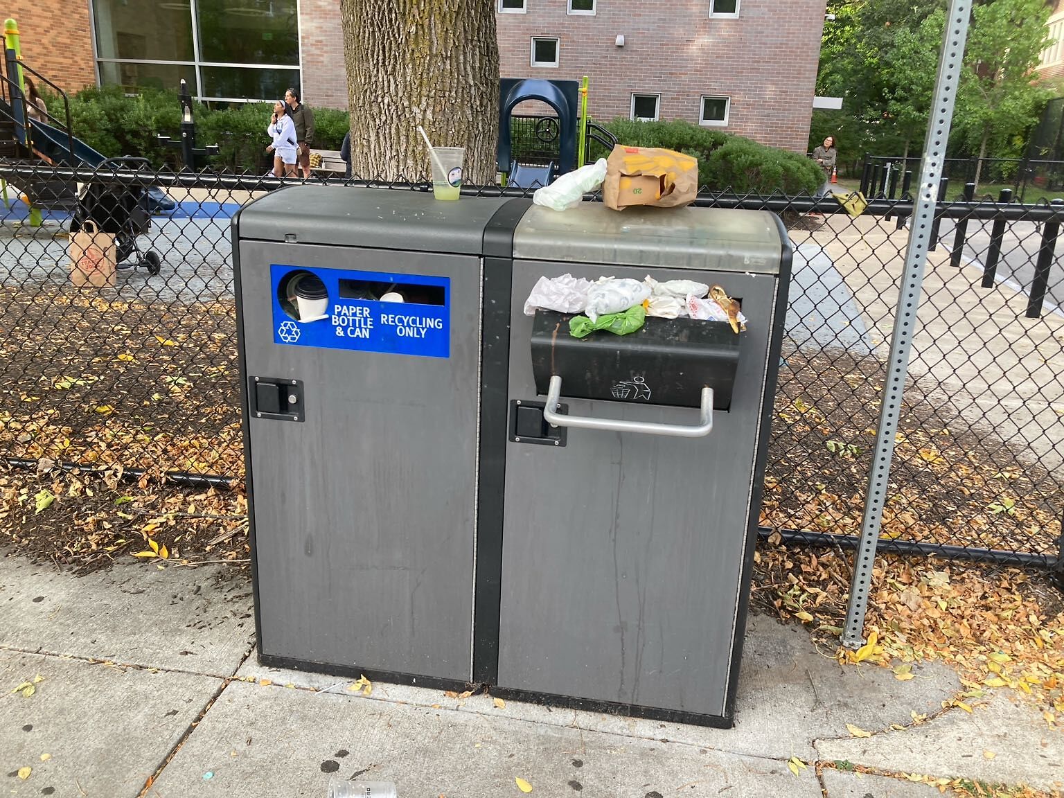 Overflowing big belly, both trash and recycling. To the right of Zaftigs. Near playground
