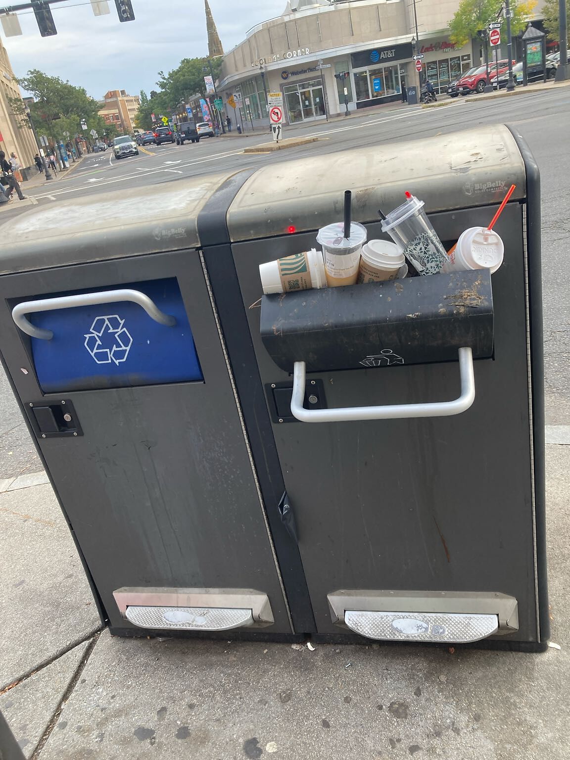 Overflowing big belly. Opposite Brookline Bank. At intersection of Beacon and Harvard Street