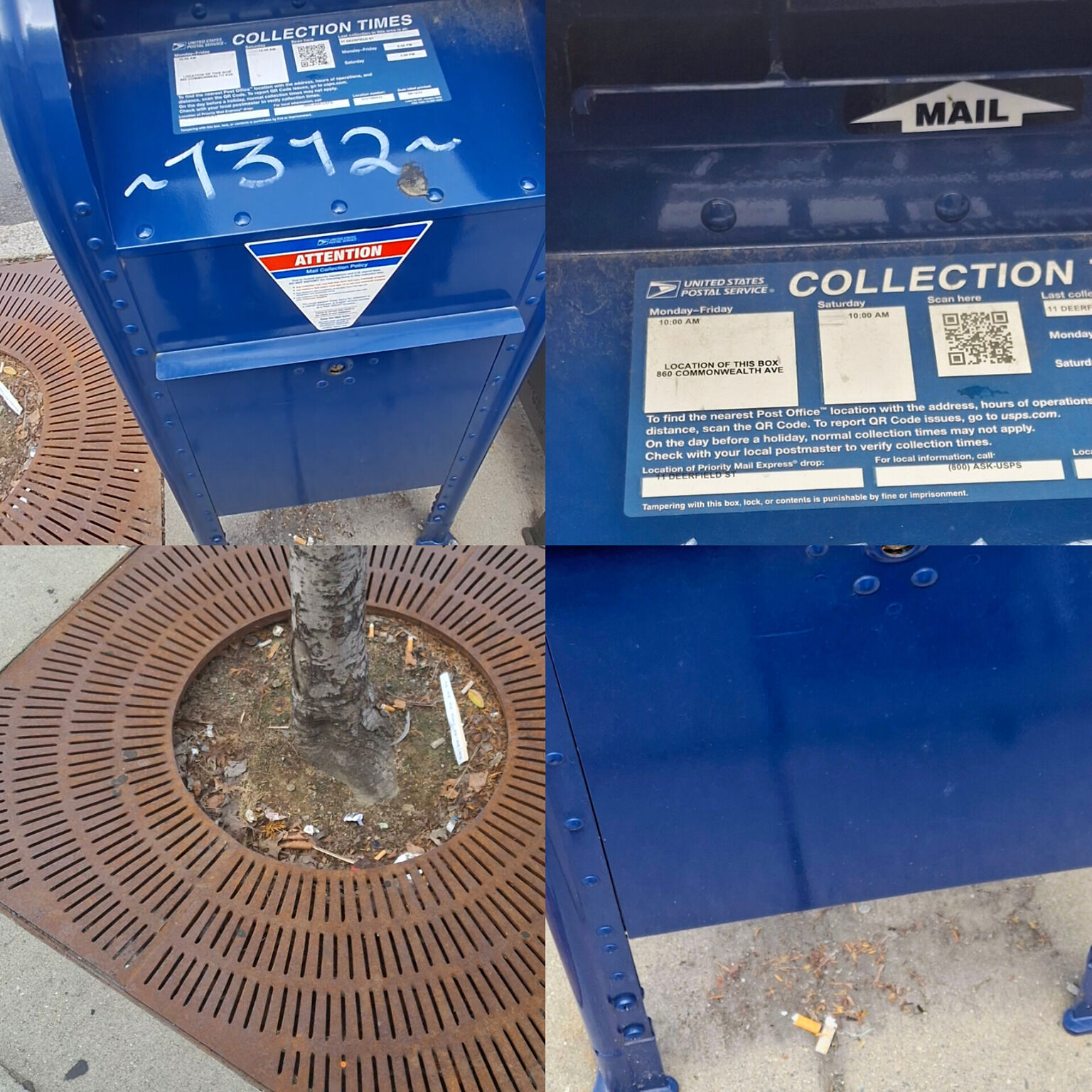 Vandalism and litter, cigarettes thrown underneath tree pits and U.S.A. issued mailbox located on 860 COMMONWEALTH AVENUE. BOSTON,MA 02215.Can the city of Boston,MA please install a sign and cigarette