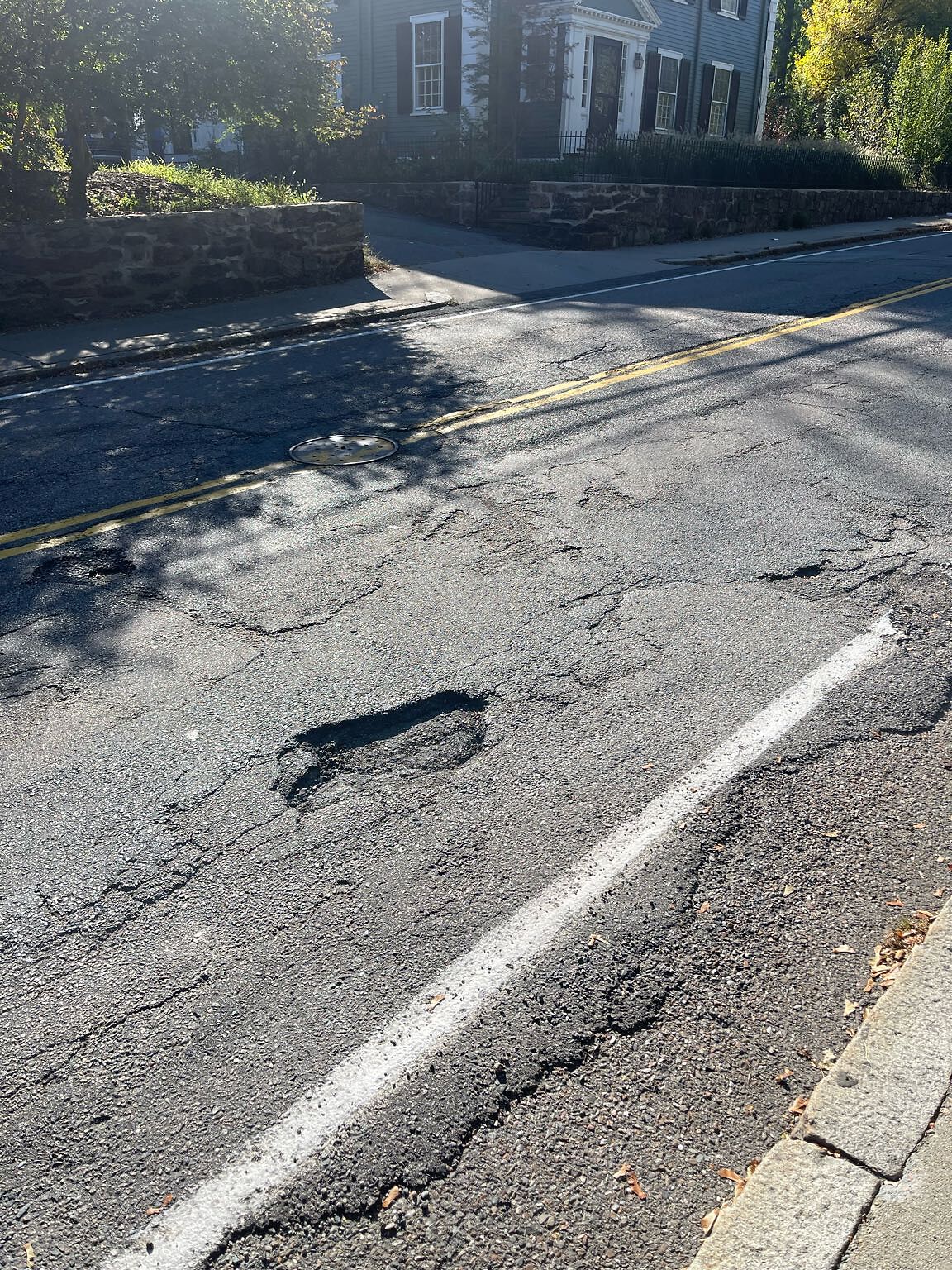 Two large potholes and one smaller pothole on the side of the hill going up high Street
