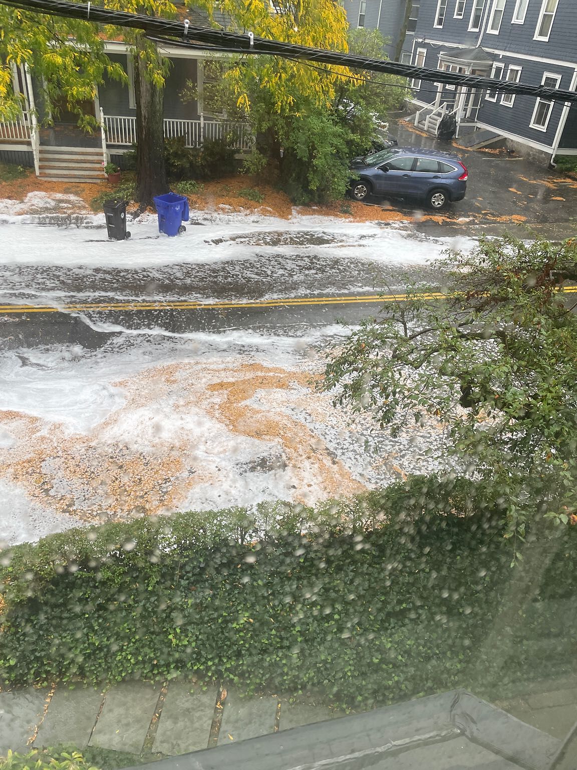 Overflowing storm drain and suds in water