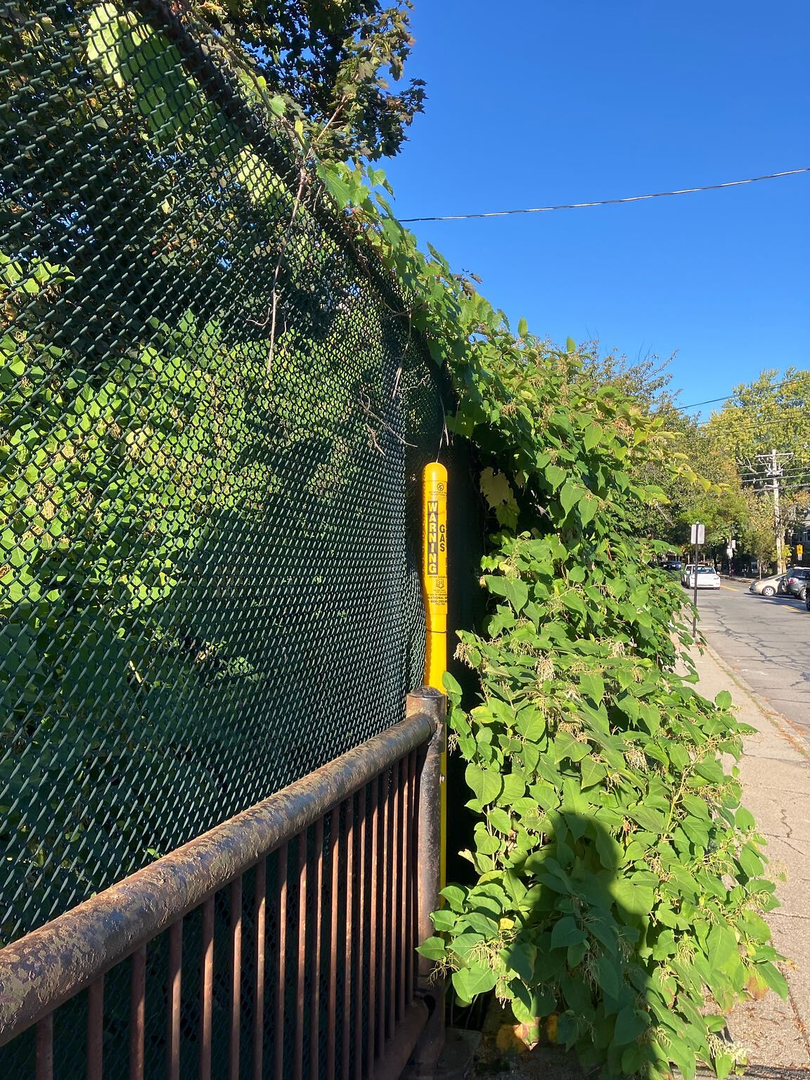 Knotweed taking over sidewalk at Aspinwall MBTA overpass.