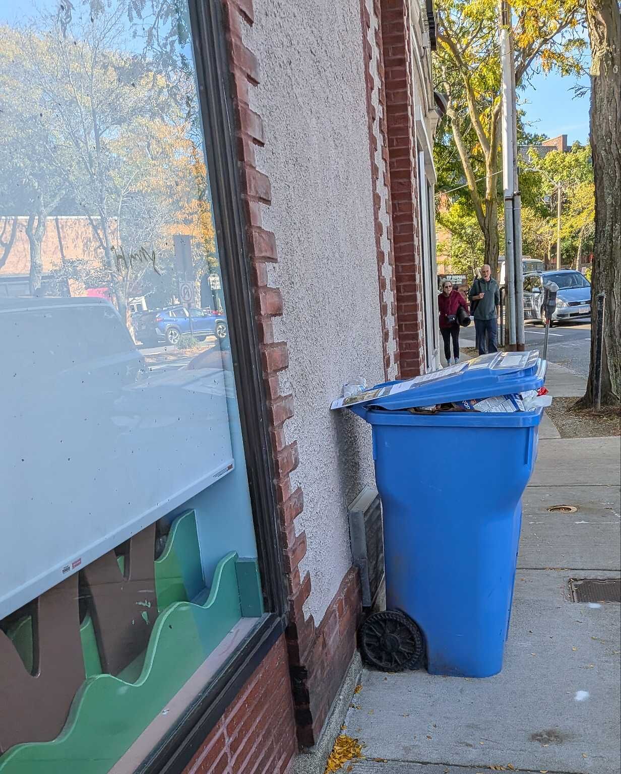 This trash bin has been here for over two weeks, along with another overflowing one in the doorway of the school.