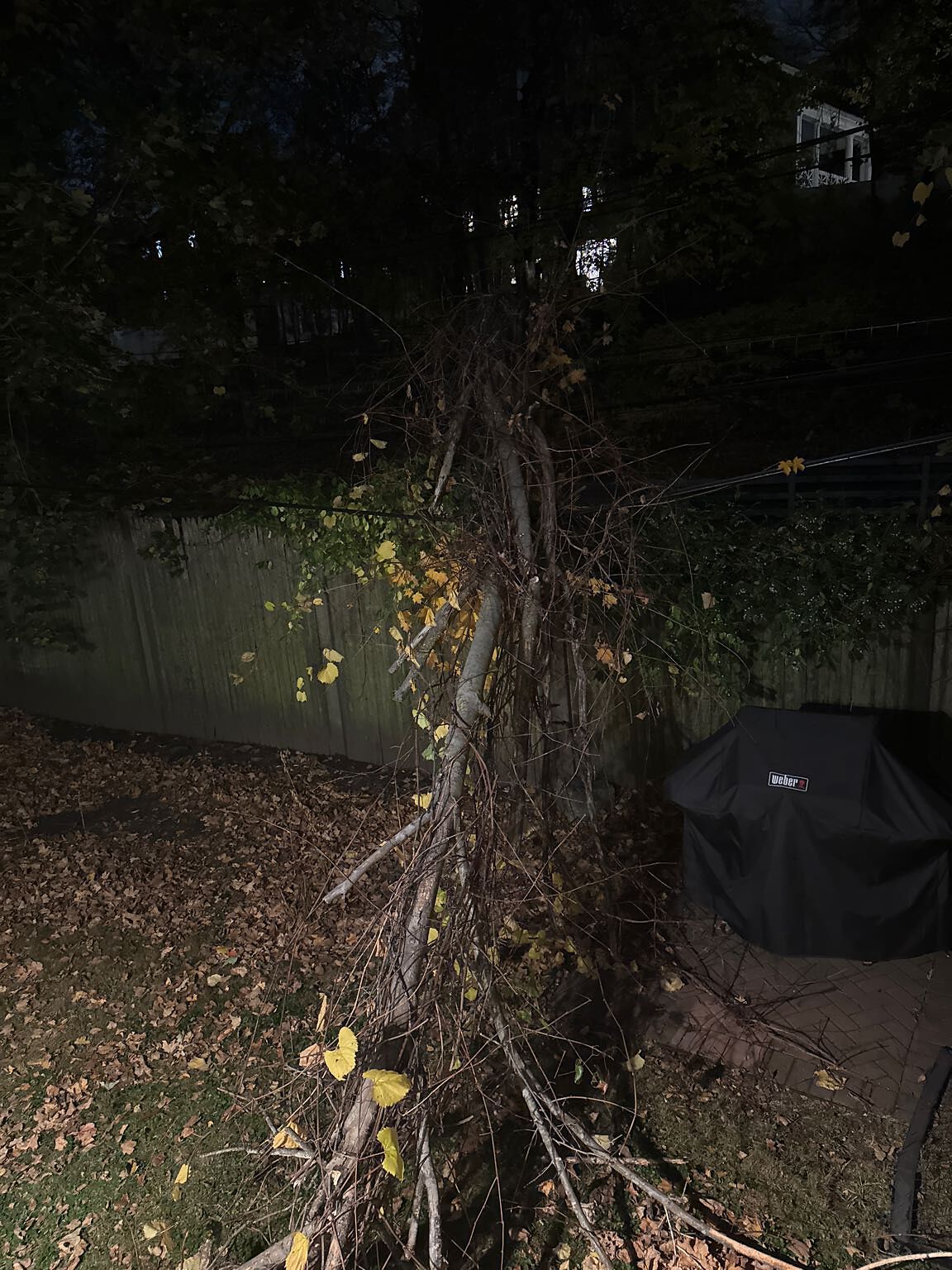 Fallen tree in yard resting on power line