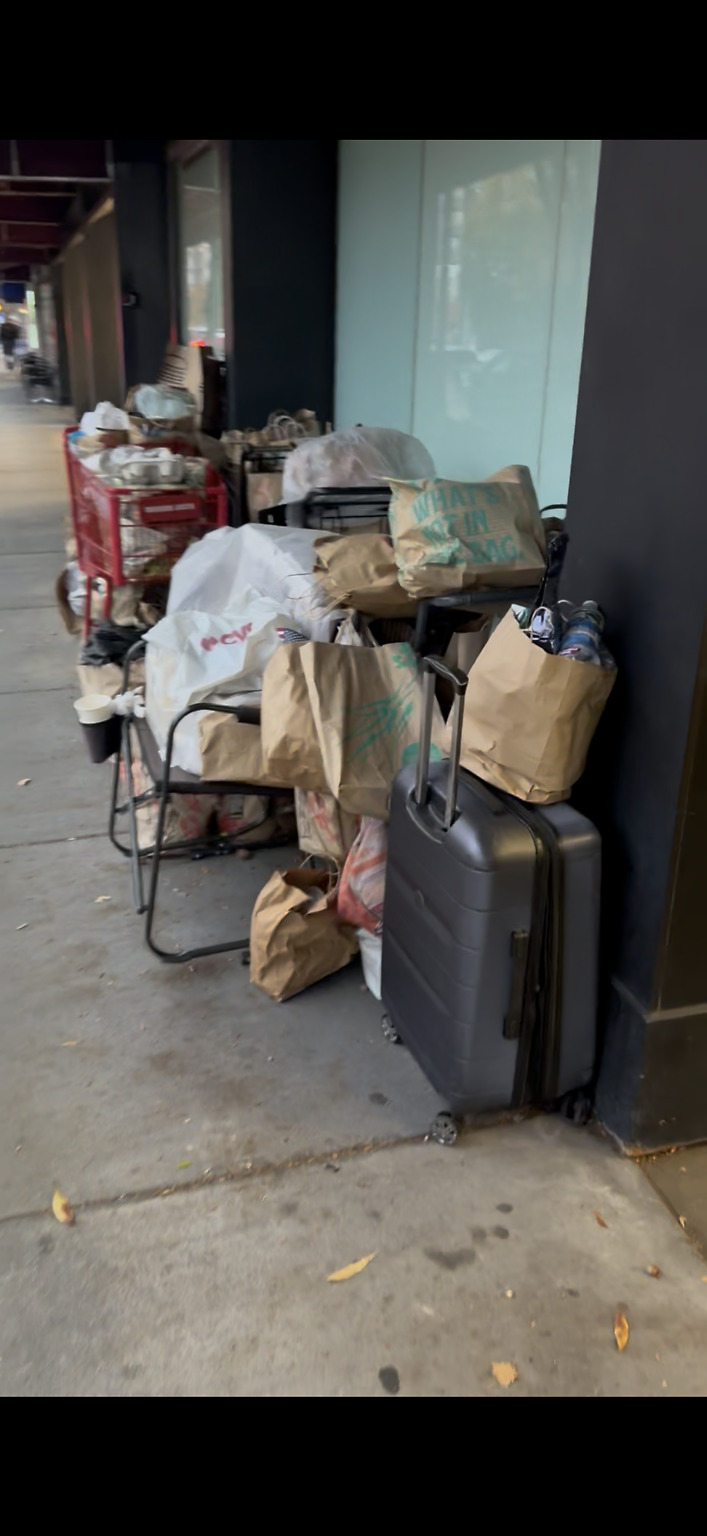 Homeless woman with many bags obstructing sidewalk