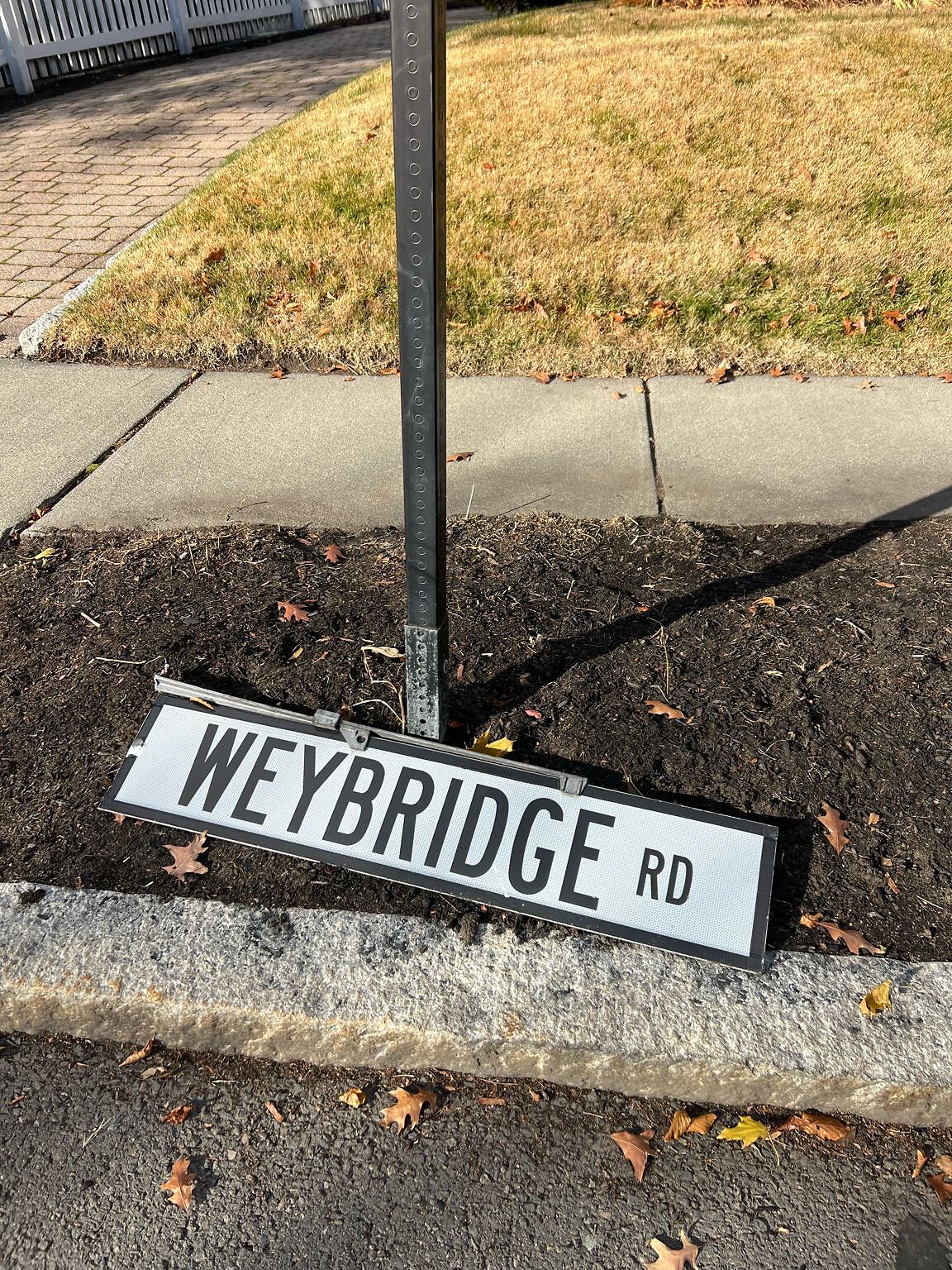 Street sign for Weybridge Rd at intersection with Somerset is lying on the ground. No damage to sign or pole is visible.