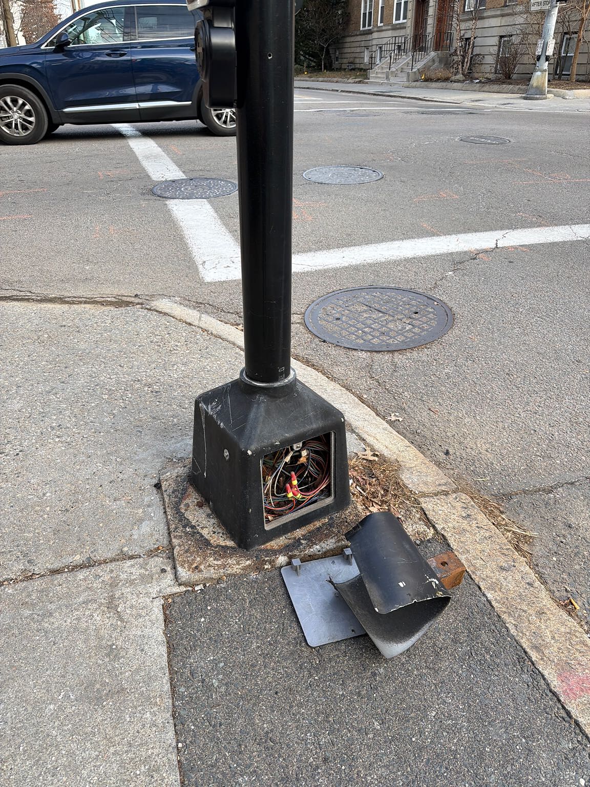 Box at bottom of light is broken/open at St. Paul/Longwood intersection