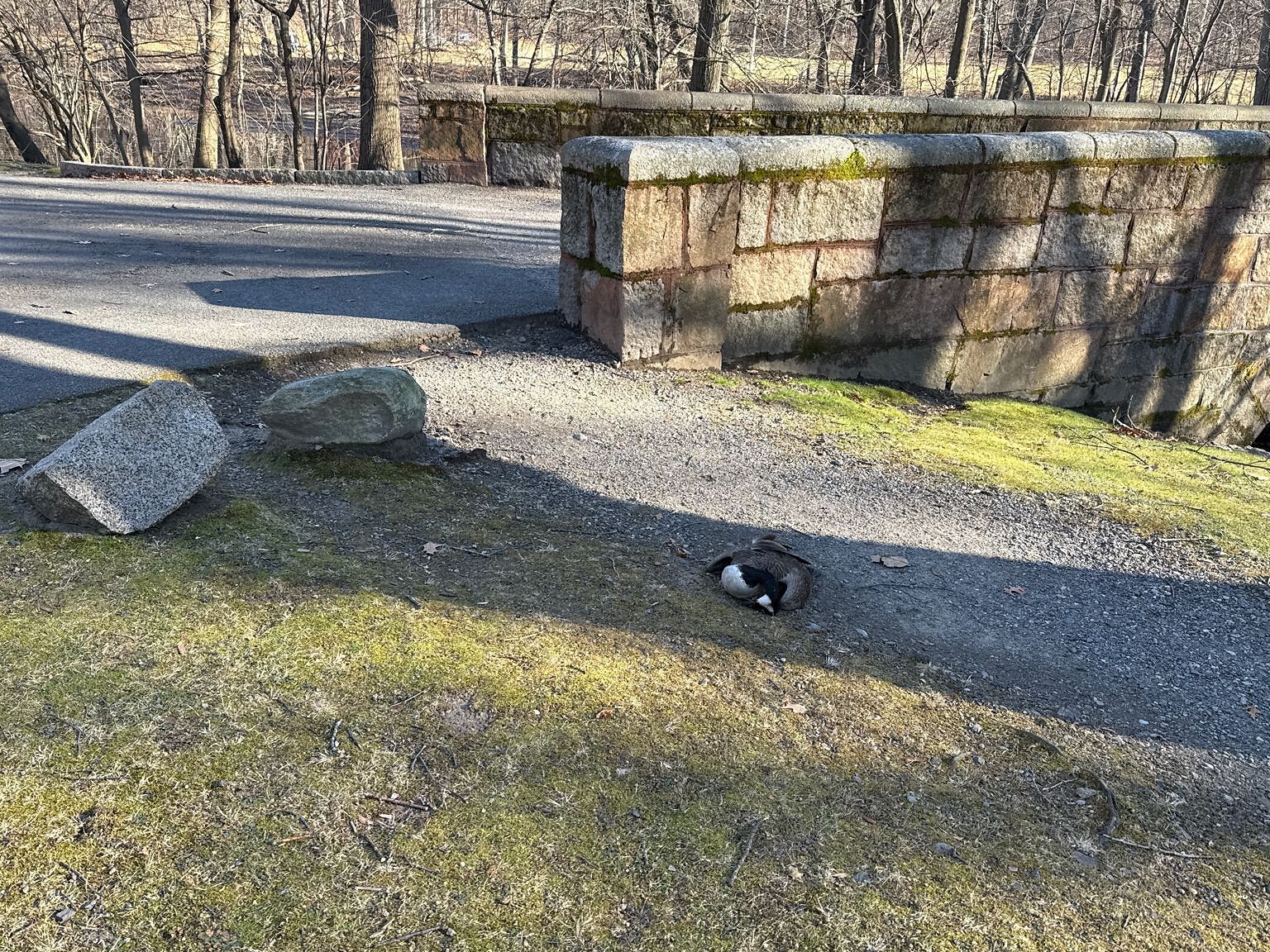 Dead goose by the pedestrian bridge, across from the Allerton St intersection