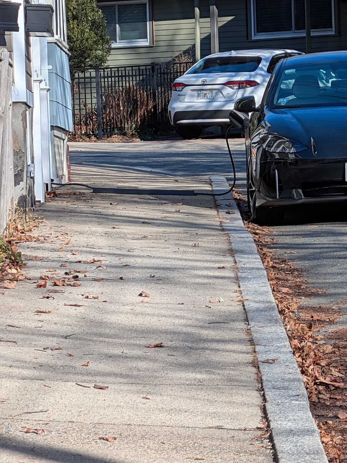 Plugged in car blocking the sidewalk