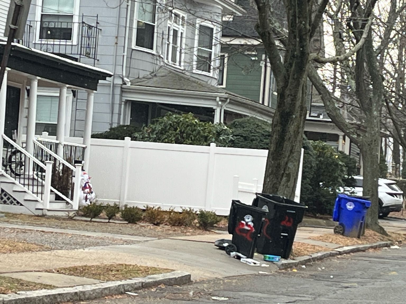 Trash containers overflowing and spilling onto the sidewalk at 22 Winslow Rd