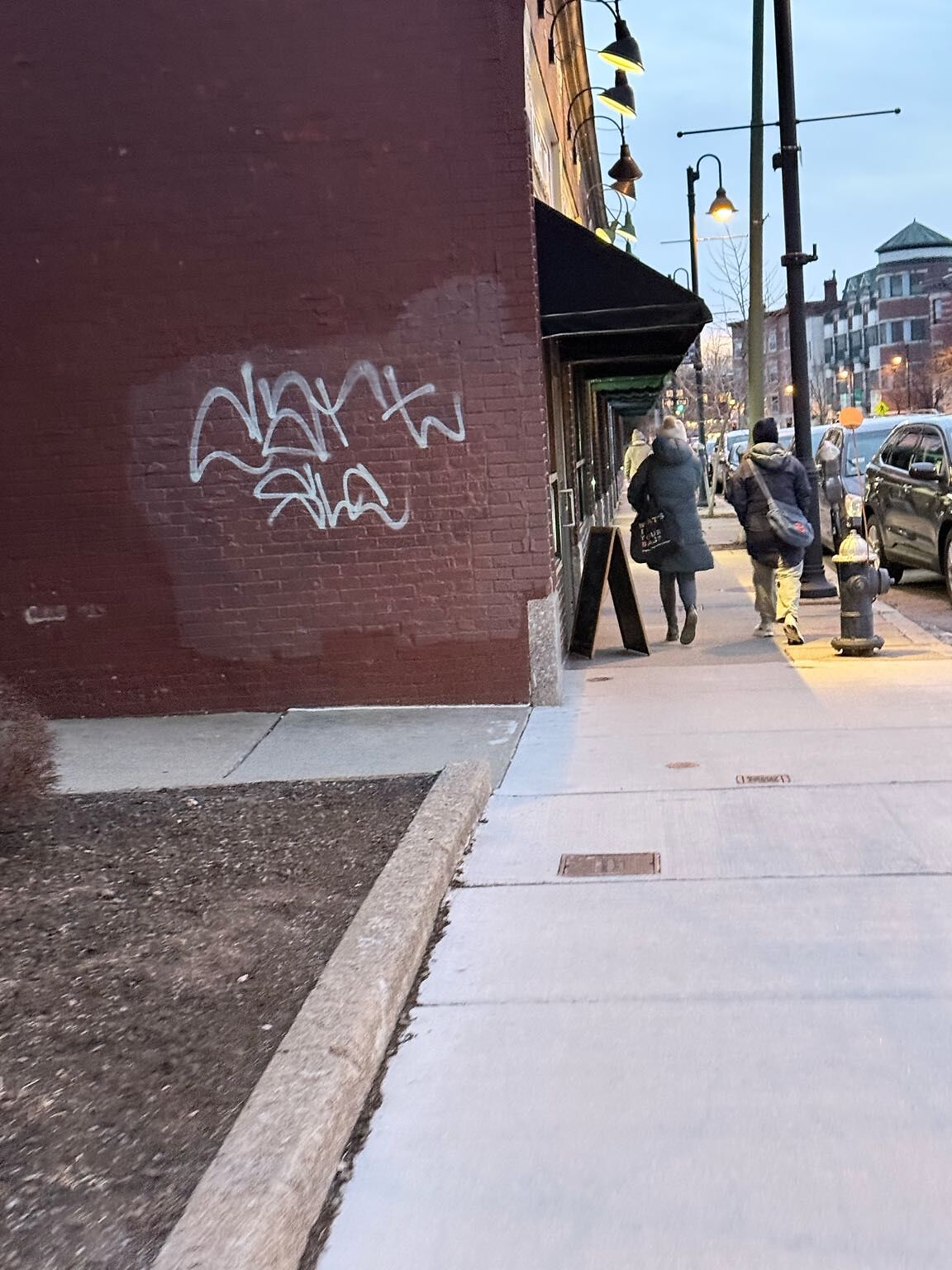 This same graffiti is on a number of walls along Harvard and has been for about a month. Please address - it looks terrible.