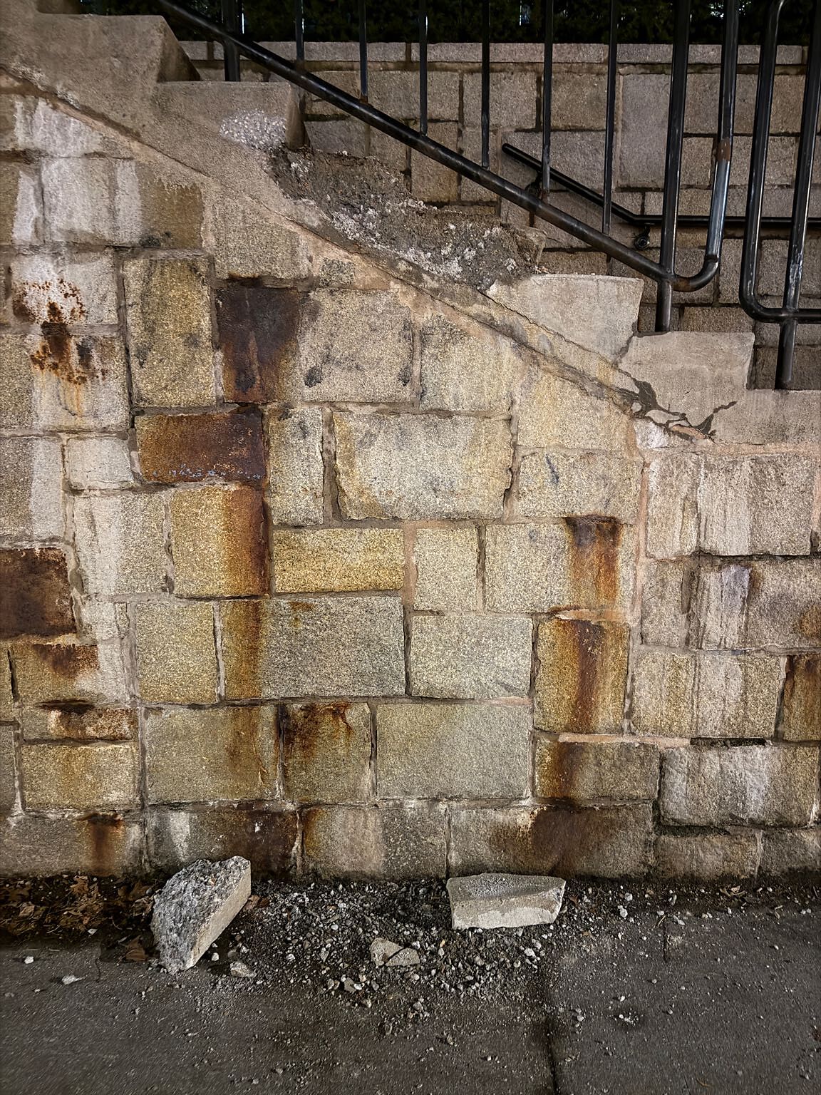 crumbling chunks of stairway is falling from kent station lot onto street